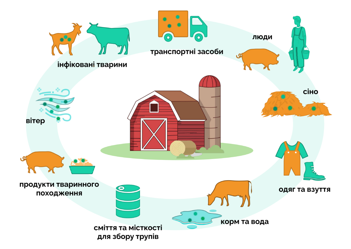 - заражені загони/будівлі або заражені транспортні засоби для перевезення тварин;
